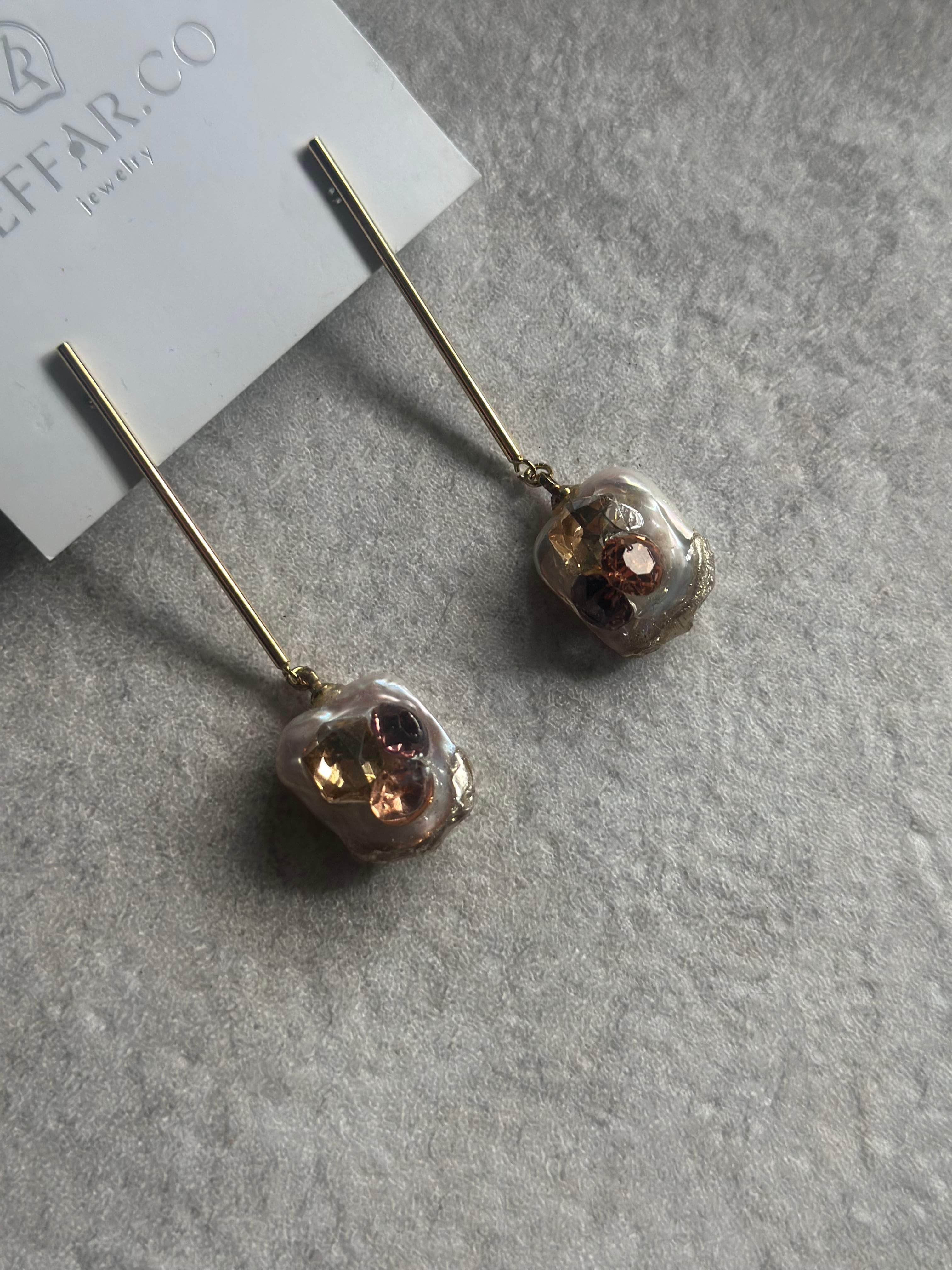 大粒の淡水パールにガラスビジューをあしらったキラッと可愛いく揺れるピアスです。