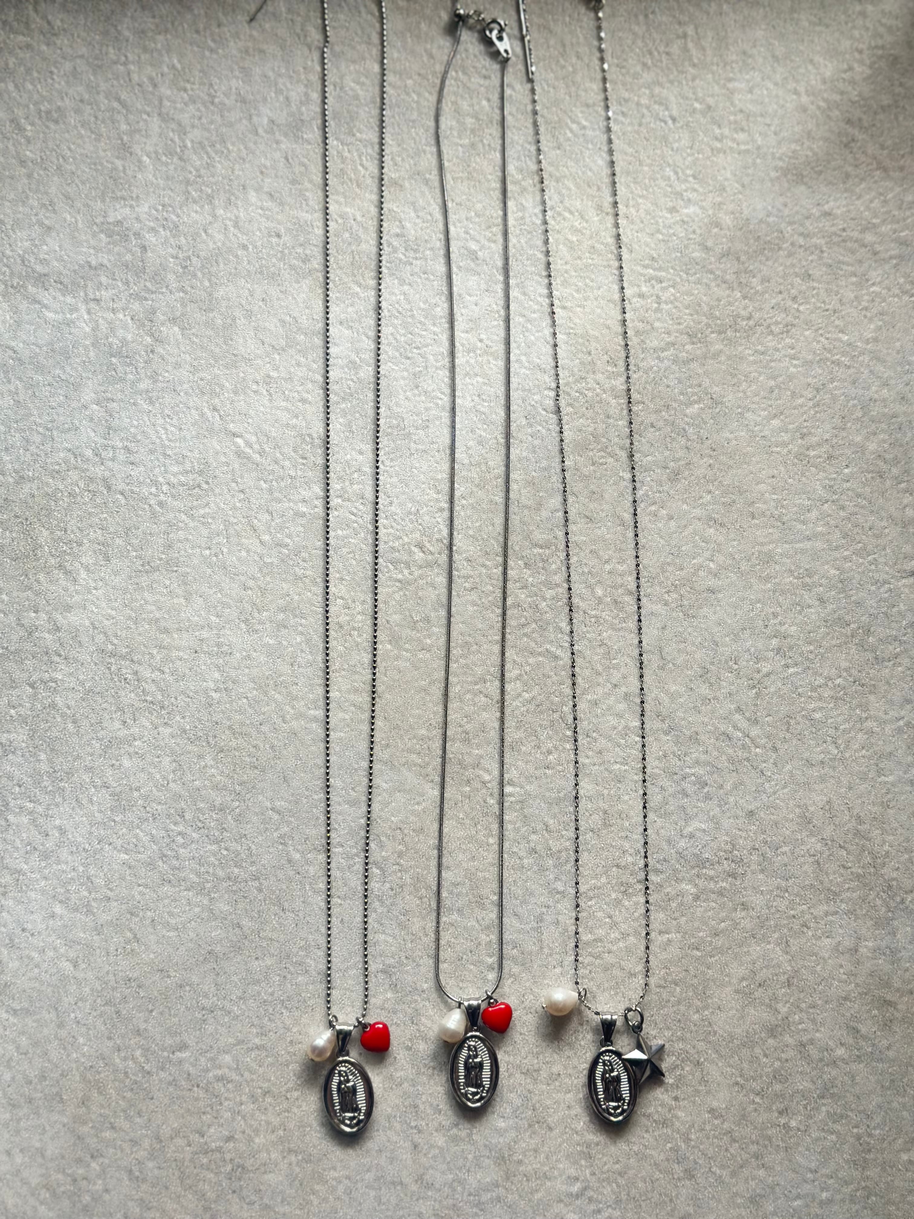 1つでも十分存在感のあるチャーム付きステンレス製のネックレス長めのアジャスター付きです。
