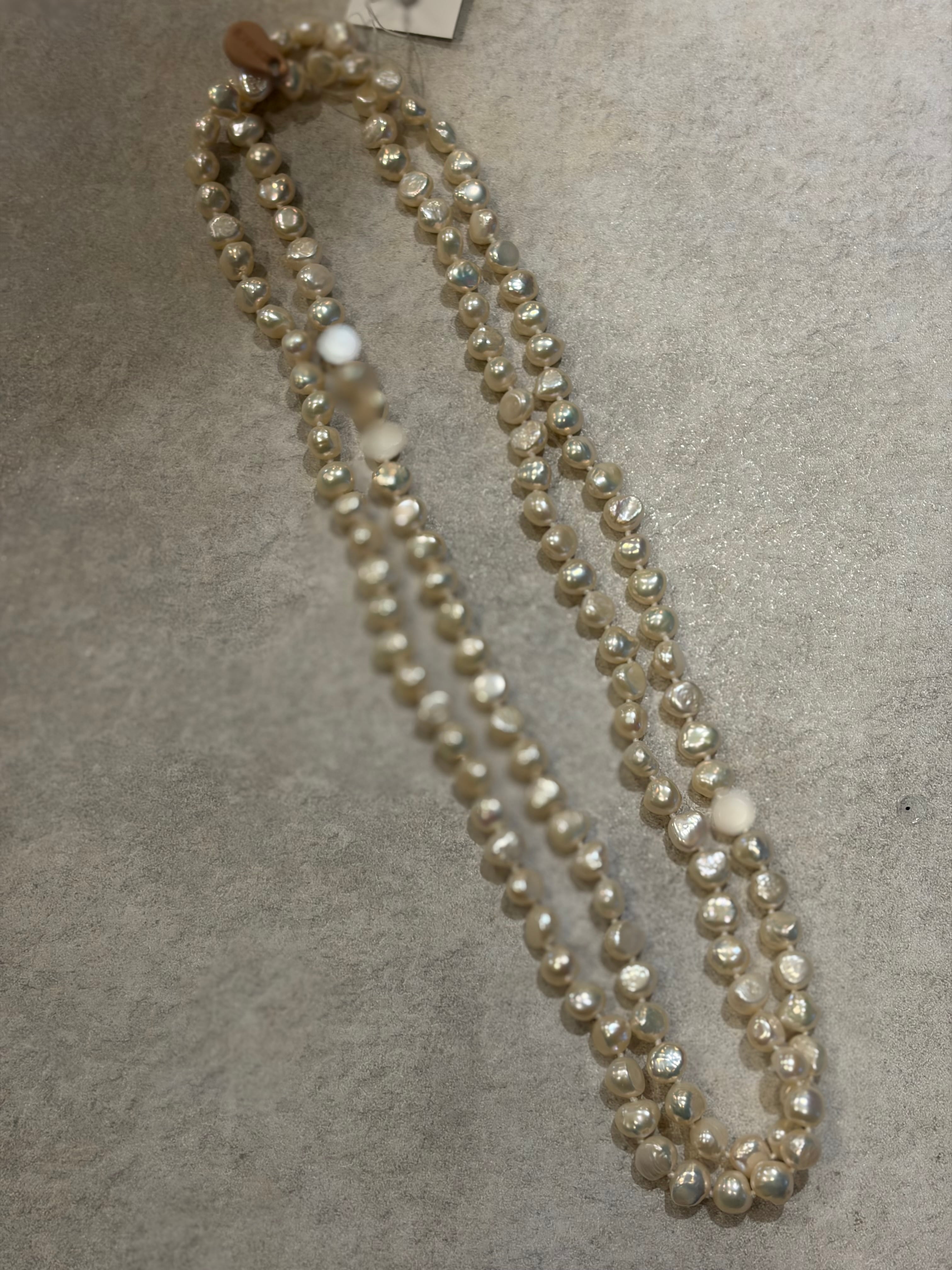 淡水パールをたっぷり使用し、職人によるオールノット技法で仕上げた滑らかな動きが出るたロングネックレスです。
