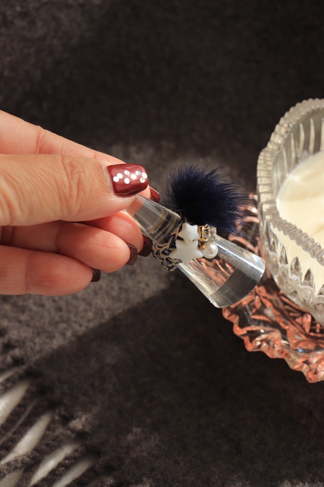 手元にファー、クリスタルやスターのパーツをプラスして冬の装いを華やかに