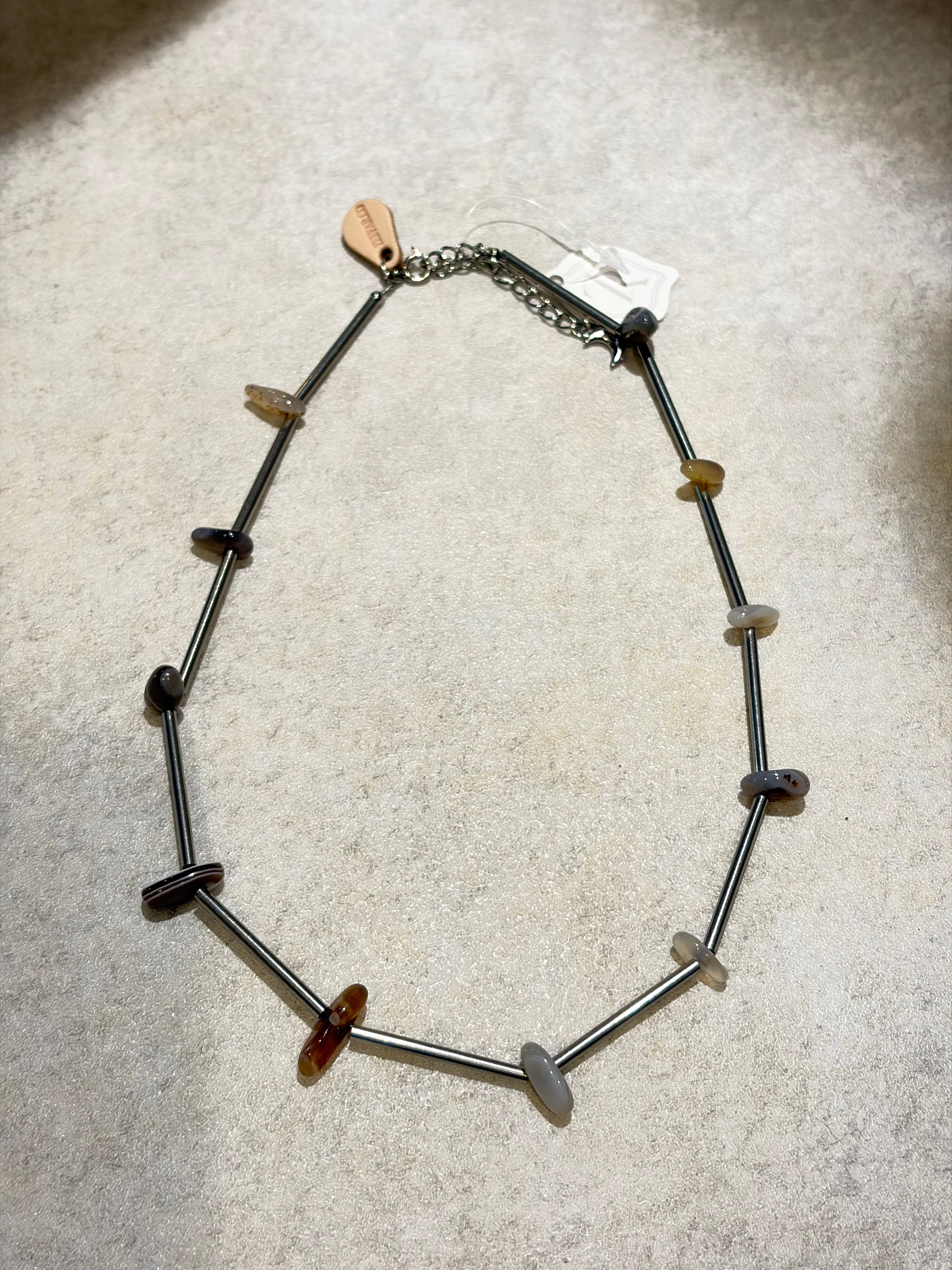 天然石メノウがドットのように配置された一本でもデザイン性がありレイヤードにも合わせやすいデザインです。