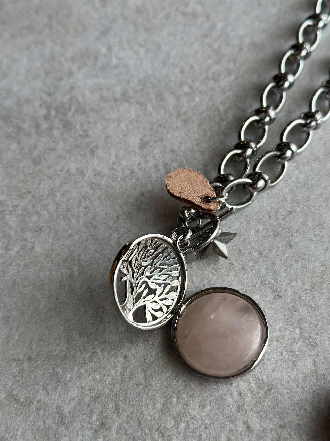 ▽素材 ステンレス 天然石ローズクオーツ 合成マラカイト 本革