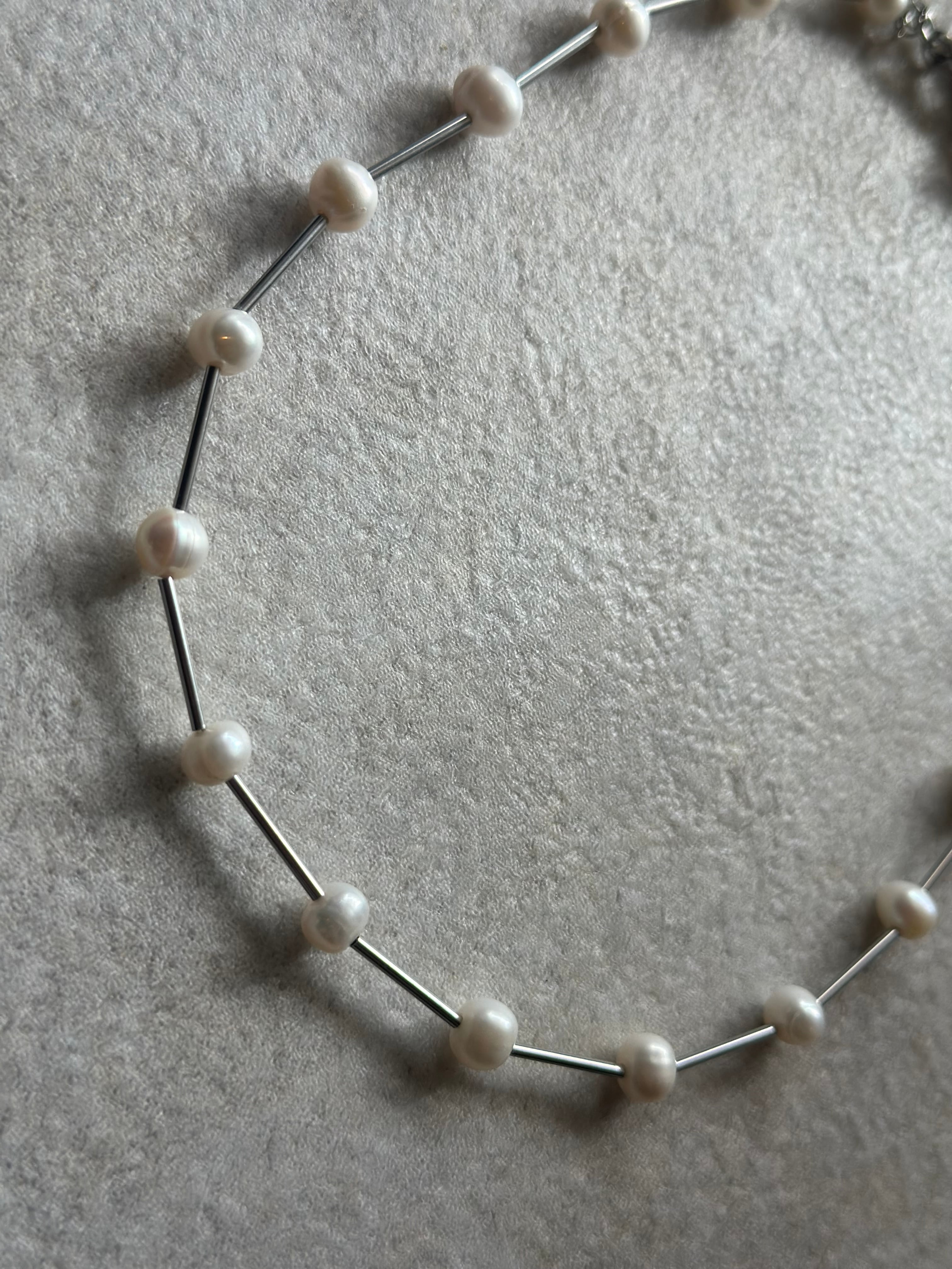 一粒6㎜前後の大玉のパールがドットのように配置された淡水パールがポイントとなり、一本でもデザイン性があり程よく主張してくれるデザインです。